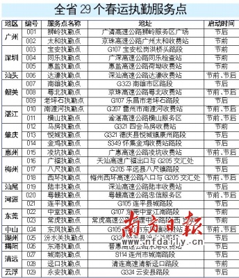 春運(yùn)期間,將在主干公路上設(shè)立29個由省廳掛牌的春運(yùn)執(zhí)勤服務(wù)點(diǎn)(見右表)。服務(wù)點(diǎn)由當(dāng)?shù)毓矙C(jī)關(guān)派民警日夜駐守,重點(diǎn)檢查7座以上營運(yùn)客車和危險化學(xué)品運(yùn)輸車輛,嚴(yán)格查處客車超員和無牌無證、報廢車上路行駛以及農(nóng)用車、拖拉機(jī)載人等嚴(yán)重交通違法行為,其中節(jié)前春運(yùn)執(zhí)勤服務(wù)點(diǎn)要從1月5日起即開始運(yùn)作。各地市還根據(jù)實(shí)際在主干公路和交通流量大的路段設(shè)置119個春運(yùn)執(zhí)勤服務(wù)點(diǎn),配備足夠的警力和裝備。如果駕駛員在旅途中遇到問題,可以及時通過這些執(zhí)勤服務(wù)點(diǎn)向有關(guān)部門求助。