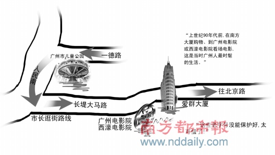 離開兒童公園,張廣寧沿人民南路向南走去。當(dāng)看到廣州電影院和西濠電影院的招牌時,張廣寧還回憶說,上世紀(jì)90年代前,在南方大廈購物、到廣州電影院或西濠電影院看場電影,這是當(dāng)時廣州人最時髦的生活。眼前,廣州電影院已變成一家KTV,而西濠電影院則變成了一家網(wǎng)吧。見此情此景張廣寧立即要求致電主管部門,了解這幾家老字號的產(chǎn)權(quán)及消失原因。