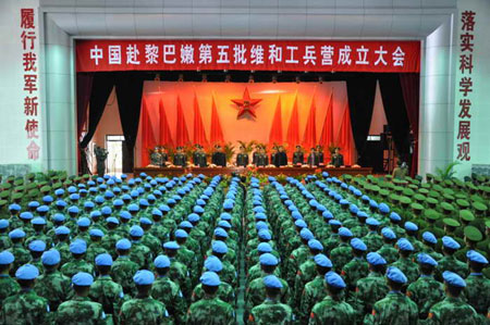 應(yīng)聯(lián)合國(guó)請(qǐng)求,經(jīng)中央軍委批準(zhǔn),中國(guó)赴黎巴嫩維和工兵營(yíng),今天(20日)在成都軍區(qū)駐滇某工兵團(tuán)正式成立。上午10時(shí),在雄壯的軍歌聲中,頭戴藍(lán)色貝雷帽、著07式迷彩服的275名官兵英姿勃發(fā)地接受了檢閱。