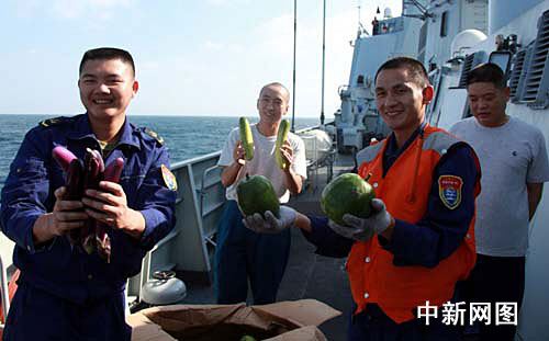 “?凇迸灩俦吲d地展示補給到艦上的新鮮蔬菜。 中新網(wǎng)記者 孫自法 攝