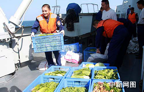 “?凇迸灩俦徇\補給到艦上的新鮮蔬菜。 中新網(wǎng)記者 孫自法 攝