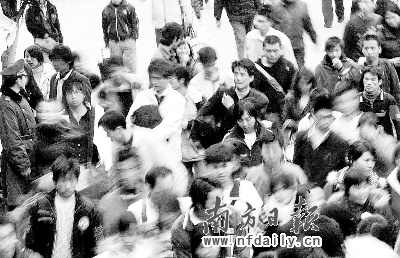 來(lái)自柳州的劉先生昨天搭乘K301次列車(chē)抵達(dá)廣州,他帶著老家的特產(chǎn)———烤鴨、雞、花生,打算送給在清遠(yuǎn)鞋廠打工的工友和在廣東的老鄉(xiāng)。陜西寶雞人包永江前年因?yàn)橐淮我馔獾能?chē)禍致殘。昨天他拄著一雙拐杖,在廣州火車(chē)東站和諧號(hào)出站口等妻子。這是他第一次外出,因?yàn)槠拮釉谧约捍蚬さ哪羌壹徔棌S里給他介紹了一份看門(mén)的工作,他從大年二十八就踏上了南下列車(chē)。為了省80元路費(fèi),他選擇先從寶雞轉(zhuǎn)到漢口,再?gòu)臐h口乘慢車(chē)抵達(dá)廣州。因?yàn)槠拮釉邳S金周長(zhǎng)假期間加班,昨天下午才能從深圳趕過(guò)來(lái)接他。至昨天,他已經(jīng)連續(xù)在車(chē)站等了6天。他希望新年里,自己能為妻子分擔(dān)一些負(fù)擔(dān),兩個(gè)人今年可以還清家里的欠帳。