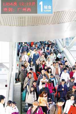 昨日上午10點(diǎn)半左右,昆明站已是人山人海,放眼望去,攜老扶幼、挎滿大包小包行囊的乘客正在秩序井然地通過(guò)安檢。“昨天乘客還少很多,但今天一早開(kāi)始,就明顯多了起來(lái)。和去年一樣,今年春節(jié)長(zhǎng)假的客流回升期依然集中在初六、初七這兩天!敝蛋嗾鹃L(zhǎng)向婭說(shuō),昆明站春運(yùn)期間臨時(shí)增設(shè)了車票大賣場(chǎng),現(xiàn)在至廣州、廈門的臥鋪票每天早上8點(diǎn)以前基本就售完。而為了應(yīng)對(duì)節(jié)后的客運(yùn)高峰,昨日增開(kāi)了4趟省際、城際列車,分別發(fā)往廣州西、上海以及曲靖。