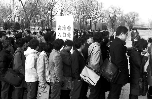 昨日上午9時許,雖然招聘現(xiàn)場內(nèi)人流量并不大,但在場外,蜿蜒的求職隊伍已排1千多米長。主辦方表示,從早晨7時就有人拿著簡歷和早餐在門口等候了。此次招聘會規(guī)定只有碩士研究生學歷以上和有工作經(jīng)驗的人才有資格參加,所以隊伍中不乏北大、清華、人大的高材生和“海歸”。招聘會設置了資格驗證環(huán)節(jié),不符合條件者不能進場。