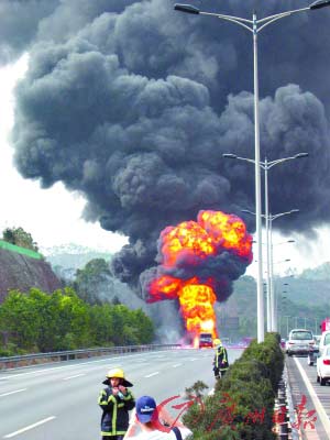 昨日下午4時(shí)20分,記者在莞深高速塘廈出入口看到,車(chē)龍排起有400米長(zhǎng),往東莞去的道路已經(jīng)封閉,記者步行4公里趕到事發(fā)現(xiàn)場(chǎng)。起火的油罐車(chē)在東莞往深圳方向的車(chē)道,熊熊燃燒的火苗躥到20米高,濃煙翻滾,人在200米外就能感覺(jué)到灼痛。