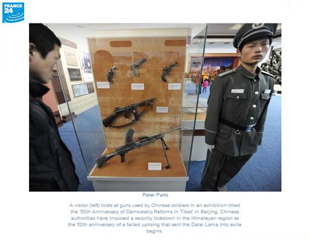 在北京舉辦的西藏民主改革50周年大型展覽中,展覽主辦者選取了幾件解放軍在1959年平息西藏武裝叛亂時繳獲的叛亂分子使用的美制和英制武器?裳酃饷翡J的網(wǎng)友卻發(fā)現(xiàn),法新社記者在3月6日的圖片報道中卻將這些武器說成是“中國軍隊使用的武器”。