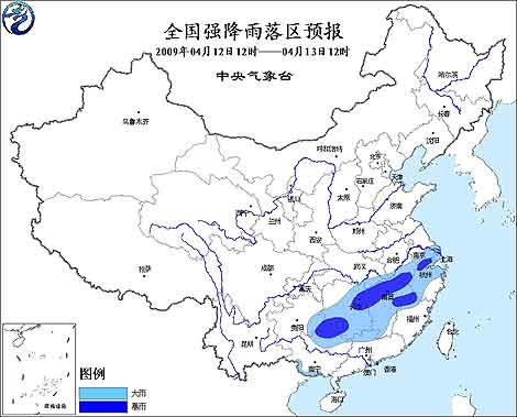 中新網(wǎng)4月12日電 據(jù)中國天氣網(wǎng)消息,中央氣象臺2009年4月12日10時發(fā)布暴雨預報: