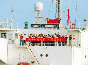4月12日,在亞丁灣海域,中國(guó)海軍首批護(hù)航編隊(duì)護(hù)送的“明達(dá)”號(hào)商船打出表示感謝的橫幅。當(dāng)日,中國(guó)海軍首批護(hù)航編隊(duì)在亞丁灣執(zhí)行最后一次單獨(dú)護(hù)航任務(wù)。至此,中國(guó)海軍首批護(hù)航編隊(duì)在亞丁灣、索馬里海域共護(hù)送40批206艘商船。(本報(bào)記者錢曉虎攝)