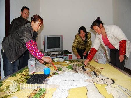 據(jù)介紹,整幅圖畫高一點(diǎn)八三米,寬三點(diǎn)零五米,以木板為底,畫面色彩搭配全部用當(dāng)?shù)厥a(chǎn)的玉米、黃豆、小豆、黑豆、蕎麥等二十多種雜糧拼貼。畫面內(nèi)容以山水環(huán)繞的棗樹村為背景,溫家寶總理居中,左右分別是棗樹村抗震救災(zāi)英雄石光華等村民。
