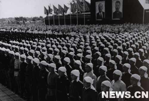 民兵們像正規(guī)軍一樣,以正方的隊形在廣場上前進。契爾文科夫同志對毛主席說:"全民皆兵真了不起!"毛主席說:"這是群眾的偉大力量!"