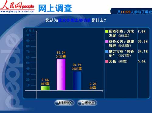 截止4月20日21點(diǎn),《您認(rèn)為駐京辦主要問題是什么?》共有36079人參與了調(diào)查;在此項(xiàng)調(diào)查中,選項(xiàng)“奢華無度 滋生腐敗”得票最高,為24025票;調(diào)查《您認(rèn)為駐京辦該不該撤銷?》,近九成網(wǎng)友投票認(rèn)為“駐京辦”應(yīng)該撤銷;在調(diào)查《您認(rèn)為駐京辦的主要功能是什么? 》中,有51%的網(wǎng)友認(rèn)為駐京辦的主要功能就是政務(wù)公關(guān),"跑部錢進(jìn)"。