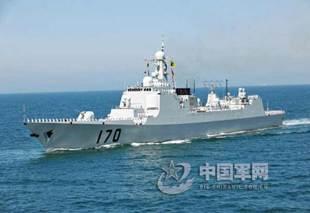 參加海上閱兵的新一代國(guó)產(chǎn)驅(qū)逐艦中,“蘭州”號(hào)導(dǎo)彈驅(qū)逐艦備受世人矚目。該艦舷號(hào)170,是中國(guó)目前最新型的導(dǎo)彈驅(qū)逐艦,在網(wǎng)上被譽(yù)為“中華神盾”。該艦2001年8月在上海江南造船廠開工建造,2003年4月下水,2005年8月出廠,2005年9月正式命名加入人民海軍序列。