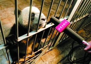 在曾有林驗貨時,飼養(yǎng)員楊海迪不失時機(jī)地給大熊貓們喂食礦泉水及蘋果、胡蘿卜等物。