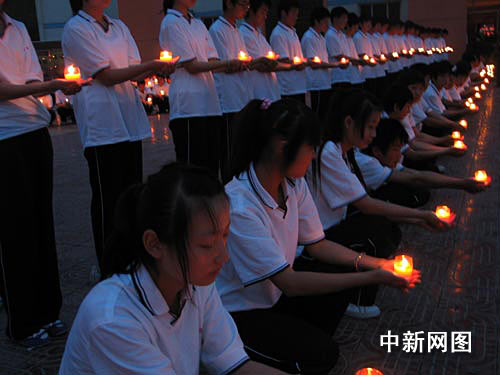 中新網(wǎng)隴南5月12日電 (記者 劉薛梅 張通飛) 11日晚上8點(diǎn),隴南市第二中學(xué)校園內(nèi),660名學(xué)生點(diǎn)燃蠟燭組成了一個(gè)“燭光大道”,校門(mén)正前方的多媒體教室內(nèi),300支蠟燭構(gòu)成了一個(gè)巨大的心形圖案,里面用蠟燭寫(xiě)著“512”、“2008”。這里正在舉行一場(chǎng)詩(shī)歌朗誦會(huì),紀(jì)念地震一周年。