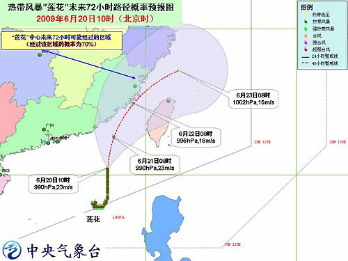 中新網(wǎng)6月20日電 中央氣象臺今天上午十時發(fā)布臺風(fēng)橙色警報:今年第 3 號熱帶風(fēng)暴“蓮花”( LINFA )的中心今天上午 10 時位于東沙島東偏南方大約 60 公里的南海北部海面上,就是北緯 20.5 度,東經(jīng) 117.5 度,中心附近最大風(fēng)力有 9 級( 23 米 / 秒)。