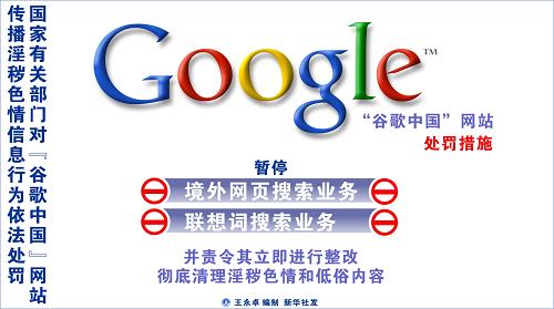 全國(guó)整治互聯(lián)網(wǎng)低俗之風(fēng)辦公室19日向媒體透露,國(guó)家有關(guān)部門(mén)已經(jīng)召見(jiàn)“谷歌中國(guó)”網(wǎng)站負(fù)責(zé)人,對(duì)該網(wǎng)站大量傳播淫穢色情內(nèi)容進(jìn)行執(zhí)法談話(huà),宣布暫停該網(wǎng)站境外網(wǎng)頁(yè)搜索業(yè)務(wù)和聯(lián)想詞搜索業(yè)務(wù),并責(zé)令其立即進(jìn)行整改,徹底清理淫穢色情和低俗內(nèi)容。