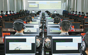 剛一進(jìn)門(mén),記者就聽(tīng)到槍炮聲、戰(zhàn)車轟鳴聲交織在一起。百余名官兵頭戴耳機(jī)端坐在電腦前緊張操控著鼠標(biāo)和鍵盤(pán),前方大屏幕上顯示“紅軍”裝甲戰(zhàn)車正快速通過(guò)“藍(lán)軍”炮火攔阻區(qū)。