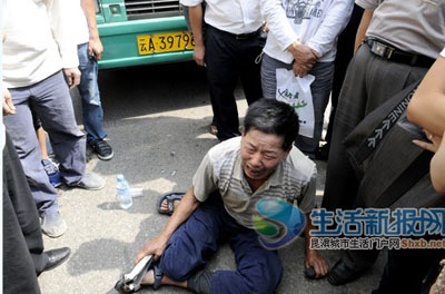 一名50多歲的男子擋在一輛77路公交車前,坐在地上痛哭,民警怎么勸說他也不愿意離開。男子稱:“這些城管太不講道理了,他們快把我的兒子打死了!睋撃凶咏榻B,20多名城管人員昨日早上將其兒子打傷,兒子被送進醫(yī)院搶救,而打人的城管全部跑了,“實在是沒有辦法,我兒子不能白白受罪,無奈之下,我只能通過這種方法引起相關部門的重視!