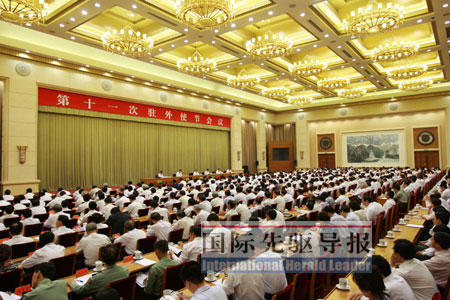 7月17日,京西賓館,中國第十一次駐外使節(jié)會議就在這樣的“簡約”布置中低調(diào)開場。身著白色襯衫的中共中央九大常委全部到場,數(shù)百位中國駐外大使、總領(lǐng)事、駐國際組織代表,以及外交部和有關(guān)部委的負責人等也悉數(shù)出席。