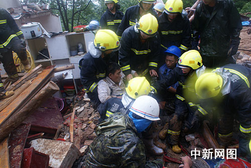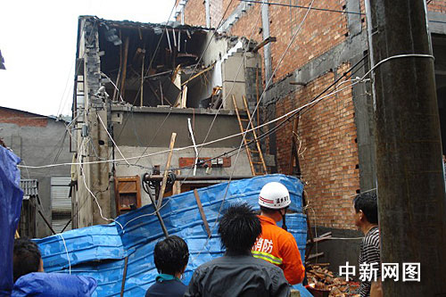 該房屋的二樓坍塌最為嚴(yán)重,房頂?shù)耐咂舅,瓦片、磚塊,泥石、水泥板堆滿了整個(gè)屋子,還有部分未完全倒塌的磚塊、梁柱仍在搖搖欲墜,現(xiàn)場一片混亂雜章。當(dāng)時(shí),正下著大暴雨,極有可能發(fā)生二次坍塌。為了控制險(xiǎn)情,消防官兵架起梯子,爬上屋頂,迅速拆除另一半未坍塌的屋頂瓦片。