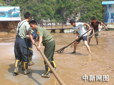 一到現(xiàn)場,消防隊員就立即鋪設(shè)水帶。在專門消防器材的幫助下,消防隊員開始對廣場淤泥進行清理。經(jīng)過艱苦奮戰(zhàn),通往景區(qū)的道路被打通,布滿淤泥的桃花谷廣場終于煥然一新,又露出了昔日干凈美麗的“面龐”。 完