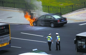 今天9時(shí)30分,(北京市)建國(guó)門內(nèi)大街由東向西方向,一輛行駛中的黑色帕薩特車突然自燃,所幸無人受傷。