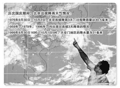 歷次國慶期間,北京曾經出現(xiàn)過幾次大雨和連續(xù)性降雨:1976年9月30日—10月2日,北京連續(xù)降雨3天,過程降雨量達40.5毫米;1959年、1979年和1996年也出現(xiàn)過連續(xù)3天降雨的情況;1999年國慶50周年前夜,北京出現(xiàn)降雨,一直持續(xù)到10月1日早晨。9月30日16時到10月1日5時,天安門地區(qū)的降水量為31毫米,給國慶活動的前期準備工作造成了影響。