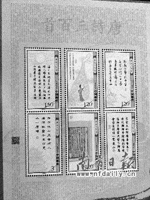 昨日省郵政公司表示,為慶祝共和國(guó)成立60周年,弘揚(yáng)中國(guó)傳統(tǒng)文化,中國(guó)郵政將于本月13日發(fā)行“世界上首套多媒體郵票”———《唐詩(shī)三百首》(見(jiàn)左圖,楊小亮攝)。此套郵票一套共6枚,全套面值9元。