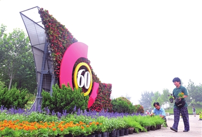昨天,國(guó)慶60周年大型花壇“普天同慶”基本完工,用鮮花等材料構(gòu)建的“60”及“紅旗”亮相朝陽(yáng)公園東門(mén)。這是今年國(guó)慶第一個(gè)完工的大型花壇,也是城區(qū)公園和環(huán)線要道最具國(guó)慶色彩的花壇。
