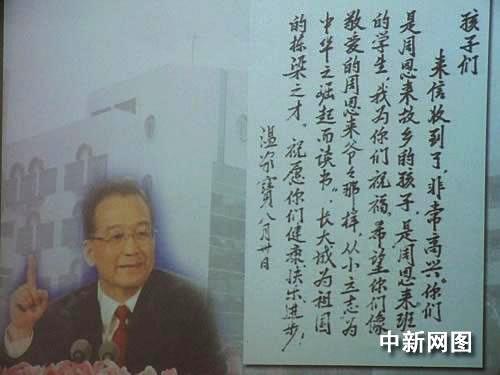 時(shí)隔兩個(gè)多月,讓孩子們激動(dòng)萬分的是居然盼到了溫總理的親筆回信。溫總理在回信中說:“你們是周恩來故鄉(xiāng)的孩子,是‘周恩來班’的學(xué)生,我為你們祝福。希望你們像敬愛的周恩來爺爺那樣從小立志‘為中華之崛起而讀書’,長大成為祖國的棟梁之才!