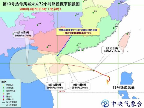 中新網(wǎng)9月10日電 中央氣象臺10日6時發(fā)布臺風(fēng)橙色警報:南海熱帶低壓于今天早晨加強為今年第13號熱帶風(fēng)暴,今天早晨5時風(fēng)暴中心位于海南省文昌市東偏南方向大約550公里的海面上,就是北緯18.8度、東經(jīng)116.0 度,中心附近最大風(fēng)力有8級( 18 米 / 秒)。