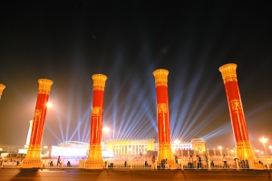 新中國(guó)成立六十周年國(guó)慶大典背景總策劃及總制作人路健康介紹說(shuō),安置在廣場(chǎng)上的“民族團(tuán)結(jié)柱”不僅點(diǎn)綴了人民大會(huì)堂與歷史博物館中間的空間,同時(shí)突破了以往慶典的平面布局,使其更附有景觀結(jié)構(gòu)感,更具有節(jié)日氣氛。