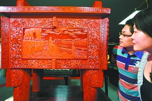 由雕漆工藝完成的鼎盛中華造型以司母戊鼎為原型,重達(dá)300多斤。制作時先經(jīng)過半年時間刷上240多層漆,再在1.2厘米厚度的漆面上進(jìn)行手工雕刻。其正面以油畫“開國大典”為內(nèi)容,背面題為“中華賦”及長城圖案。象牙作品以長兩米、重320斤的百年“老”象牙材料為基,以56個民族載歌載舞為主題,背景是30處世界文化遺產(chǎn)。象牙、雕漆、玉器和景泰藍(lán)被譽(yù)為工藝美術(shù)界的“四大名旦”,另外兩項(xiàng)巨作景泰藍(lán)“太平有象”和玉雕“九龍?jiān)》稹币矊㈥懤m(xù)亮相。 (記者耿諾)