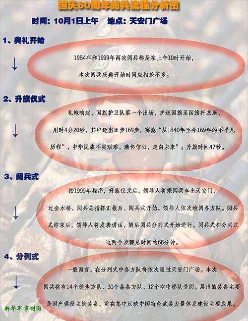國慶慶典的時間和地點毋庸質疑是10月1日上午10時、天安門廣場。1984年和1999年的兩次慶典都是在上午10時開始的。由此推斷,這次的程序和開始時間也不會相差太多。