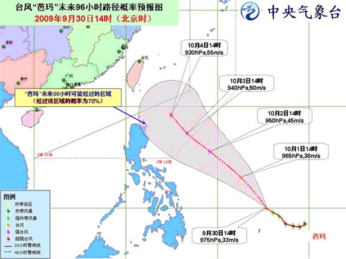 中新網(wǎng)9月30日電 據(jù)中國氣象局網(wǎng)站消息,今年第17號強熱帶風暴“芭瑪”于30日下午在菲律賓以東洋面加強為臺風,30日17時其中心位于菲律賓馬尼拉東南方大約1560公里的洋面上,就是北緯10.3度、東經(jīng)134.7度,中心附近最大風力有12級(35米/秒),中心最低氣壓為970百帕。