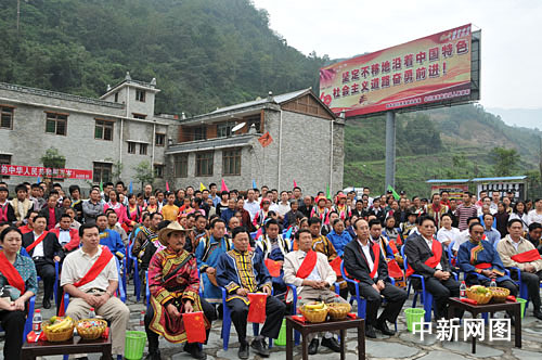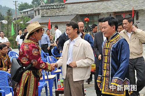 當(dāng)日的涼風(fēng)埡卓卓羌寨,處處洋溢著歡樂祥和的喜慶氣氛:羌族群眾身著節(jié)日盛裝喜形于色,孩子們手持小國旗歡快地嬉戲,羌寨廣場上正在舉行“建國60周年圖片展”……。上午9時40分,當(dāng)李崇禧、歐澤高、吳靖平、曾萬明等省市領(lǐng)導(dǎo)來到羌寨廣場時,熱情好客的羌族群眾紛紛圍上去向他們獻(xiàn)上羌紅。李崇禧關(guān)切地向老鄉(xiāng)們詢問災(zāi)后重建進(jìn)展及當(dāng)前生產(chǎn)生活情況,他飽含深情地說:“今天是偉大祖國60歲的生日,受省委書記劉奇葆同志、省長蔣巨峰同志的委托,我們專程來看望大家,并和大家一起過節(jié)。”