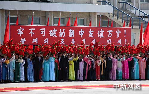 溫家寶一行乘車前往平壤市區(qū)途中,數(shù)十萬平壤市民身著節(jié)日盛裝,揮舞中朝兩國國旗、花束和標(biāo)語,高呼中朝友好口號,夾道歡迎。溫家寶在金英日陪同下,站在敞篷汽車上向歡迎群眾揮手致意,并多次下車,與他們握手。車隊途經(jīng)平壤凱旋門時,朝鮮少先隊員向溫家寶敬獻(xiàn)鮮花,并給溫家寶系上紅領(lǐng)巾。