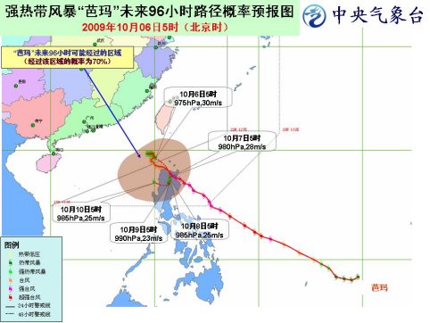中新網(wǎng)10月6日電 中央氣象臺6日6時(shí)發(fā)布臺風(fēng)預(yù)報(bào)稱,今年第17號強(qiáng)熱帶風(fēng)暴“芭瑪”將以每小時(shí)10公里左右的速度向南偏東方向移動,并將于6日下午到夜間在菲律賓呂宋島北部沿海登陸,強(qiáng)度緩慢減弱。