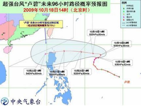 18日17時,“盧碧”的中心位于菲律賓馬尼拉東偏北方大約1400公里的西北太平洋洋面上,就是北緯17.5度、東經(jīng)133.8度,中心附近最大風(fēng)力有16級(55米/秒),中心最低氣壓為925百帕。