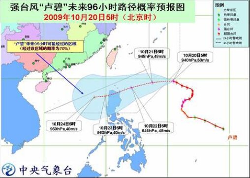 中新網(wǎng)10月20日電 中央氣象臺20日6時發(fā)布臺風預報:強臺風“盧碧”將以每小時20公里左右的速度先向偏西方向移動,以后將轉向西偏南方向移動,逐漸向菲律賓呂宋島東北部沿?拷,強度緩慢減弱。
