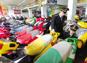 在長(zhǎng)寧路一家銷售店內(nèi),擺放著36輛電動(dòng)自行車,其中20輛的重量超標(biāo)。銷售人員說(shuō):“一般只有裝鋰電池的車不超標(biāo),要想達(dá)標(biāo),除非稱重時(shí)拿掉電瓶。”