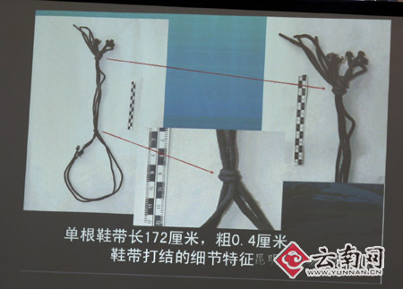 警方通過幻燈片展示了兩條單根長172厘米,粗0.4厘米的鞋帶。此鞋帶來源于邢鯤所穿的一雙高幫旅游鞋。邢鯤是經(jīng)過警方檢查,將鞋置于候問室外后,把兩根鞋帶藏匿于上衣口袋中帶入候問室的。