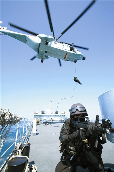 “報告!發(fā)現(xiàn)疑似海盜船尾隨商船船隊!”航行在亞丁灣海域的海軍第四批護航編隊迅即進入一級反海盜部署:海軍特戰(zhàn)隊員奉命隨船護衛(wèi),直升機飛臨商船上空懸停,4名特戰(zhàn)隊員敏捷地滑降到商船上,進入高度戒備狀態(tài)。