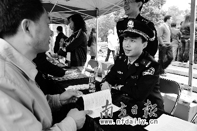 前來現(xiàn)場咨詢的群眾絡繹不絕。伍女士與丈夫帶著6歲的小孩一家子圍著現(xiàn)場的民警仔細地問。伍女士是江門臺山人,她1993年就來到廣州,在一家私人企業(yè)做工。工作了10多年,為了小孩讀書,勒緊了褲帶在越秀區(qū)文明路買了一套60多平方米的二手房,感覺自己多少有點像廣州人了。廣東即將推行居住證的消息讓她期待滿懷:“等了很久啊,現(xiàn)在看到了希望,有了戶口,才能真正讓自己在這里扎根下來啊!”
