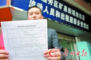 然而記者仔細(xì)看了看工作人員要求填寫的登記表,卻發(fā)現(xiàn)還是原先辦暫住證時(shí)所填的《廣州市流動(dòng)人員信息登記表》,至于居住證的申請(qǐng)表是何模樣,就連工作人員也稱沒能見上一眼。