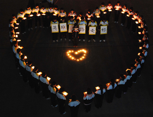 中新網(wǎng)九江一月二十日電 (胡國林)“我們在這里為你們點亮心燭,照耀你們前行的路,祝你們一路走好”,一月十九日晚七點半,在江西九江市晨光中學(xué)的操場上,綿陽班的學(xué)生郭鑫手捧蠟燭,眼含熱淚表示。當(dāng)晚,五十余名綿陽班的學(xué)生點燃蠟燭為在海地地震中遇難的八名中國維和英雄和海地人民祈福。
