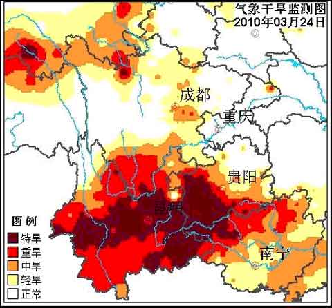 3月24日氣象干旱監(jiān)測(cè)顯示,云南大部、貴州西部和南部、廣西西部和北部、四川南部等地存在中度以上氣象干旱,其中云南除西北部和東北部的其它大部地區(qū)、貴州西南部、廣西西北部等地存在重度以上氣象干旱。