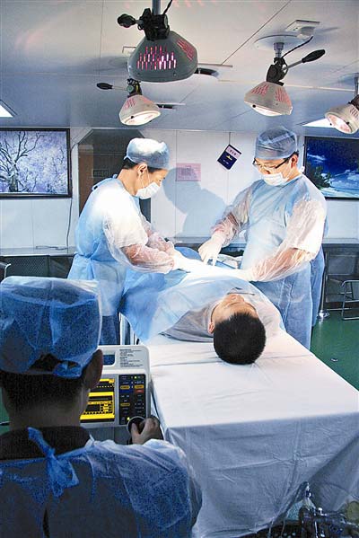 消毒、殺菌、安裝無影燈……不到30分鐘,南海艦隊(duì)“廣州”艦軍官餐廳就變成了寬敞、無菌的手術(shù)室,一場闌尾切除術(shù)演練正在這里緊張進(jìn)行。當(dāng)?shù)貢r(shí)間29日上午9時(shí),中國在執(zhí)行第4批護(hù)航任務(wù)途中,成功進(jìn)行了抵達(dá)亞丁灣、索馬里海域以來的首次海上模擬手術(shù)演練。(張旗 曹海華)