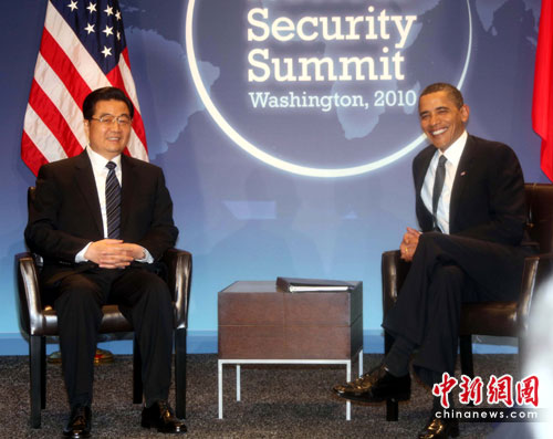 中新社華盛頓4月12日電 (記者 張朔 吳慶才)中國(guó)國(guó)家主席胡錦濤當(dāng)?shù)貢r(shí)間12日下午在華盛頓會(huì)見美國(guó)總統(tǒng)奧巴馬,雙方就中美關(guān)系及共同關(guān)心的重大國(guó)際和地區(qū)問題交換了意見,達(dá)成重要共識(shí)。胡錦濤就下階段中美關(guān)系發(fā)展提出5點(diǎn)重要主張。