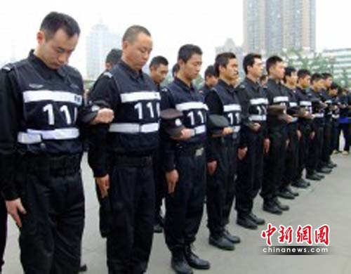今晨,成都的上空被陰云籠罩,陰沉沉灰蒙蒙的天空使整座城市都沉浸在哀悼的氛圍當(dāng)中。上午10點(diǎn)許,成都市公安局青羊分局巡警大隊(duì)二十余名干警邁著整齊的步伐來到天府廣場,面對降下的半旗,向在這次地震中遇難的藏族同胞們默哀三分鐘。不少市民紛紛前往向遇難同胞默哀。
